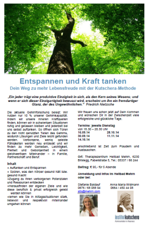 Dein Weg zu mehr Lebensfreude mit der Kutschera-Methode Termine: jeweils Dienstag von 18.30 – 20.30 Uhr